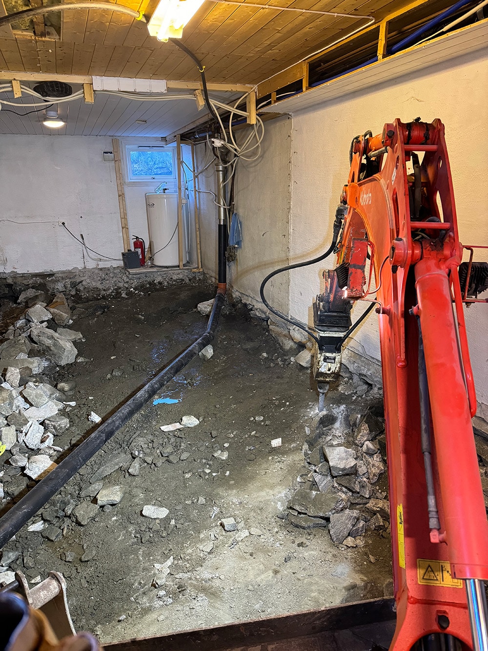 2. Utgraving og senking av gulv: Vi graver ut kjellergulvet forsiktig, lager et fundament for det nye gulvet, og senker det til ønsket nivå. Dette kan inkludere fjerning av gammel betong og forberedelse av underlaget for nytt gulv.
